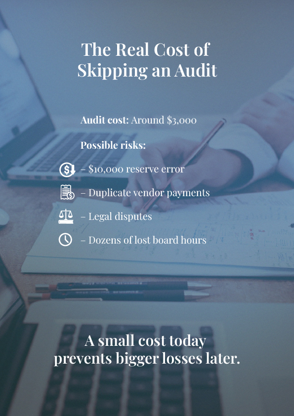 As mentioned above, some HOAs tick along fine for years on the same audit cycle, and then one year, everything can change. It could be a larger budget or a few raised eyebrows at the AGM.